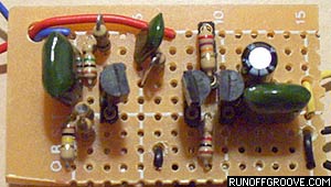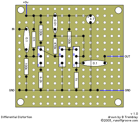 I don't always like a lot of low end, so I swapped the 0.01uF cap over the PNPs. I changed it to 10uF to see what it would do. The sound didn't really change much but it did have an even looser feel. I suspect one would have to increase the size of the in and out caps to realize the full effects. I worked my way through values all the way to 150pF As you go up above 0.01uF, the low end gets less and less massive. I like values around 0.001uF for a good cutting sound with a Strat. The circuit sounds similar to a friend's Silver Face Super Reverb cranked. At 150pF, you have a huge treble boost. I think I'll stick between 0.01uF and 0.001uF. The trimmer on the NPN will have to be adjusted for different cap values. Also, I tried the Guitarkit.com suggestion of adding a 10M to ground from the 470k/0.01uF junction. It made it feel more hi-gain, but I don't feel it is a sound I would use. The sustain is greatly reduced and notes feel "choked off."