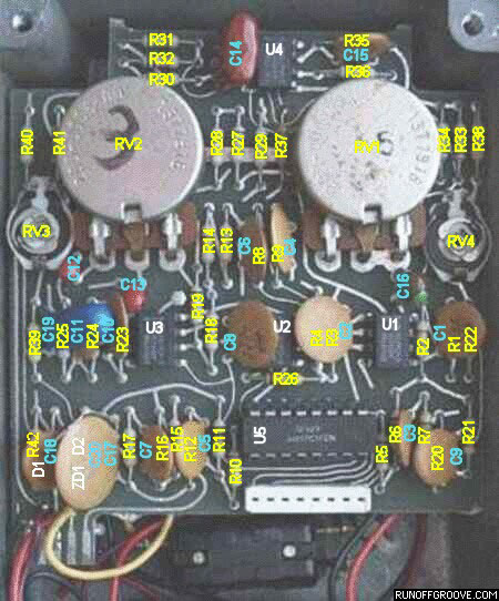 My Ross Phaser, in its stock form, had a bit of a volume boost when engaged. Also, the effected signal had a slightly excessive amount of treble. Mark Hammer (hammer.ampage.org) suggested the following modifications (refer to the above schematic and parts overlay links for the components):