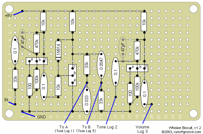 The Whisker Biscuit is a hybrid of the Bazz Fuss and the Big Muff Pi. A single Bazz Fuss stage replaces the two clipping stages of the BMP. Smooth, super-long sustain, and good clean-up with the guitar volume knob make this circuit an interesting alternative to the standard BMP. For a velvet-like reduced treble sound, add in one or both optional 47pF caps. See the scheamtic below for a Tone control mod that provides less extreme settings. Thanks to E-H and Christian.